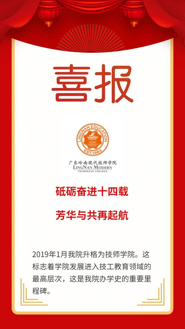 2019年1月,经广东省政府批准,广东利来国际现代高级技工学校晋升为技师学院。